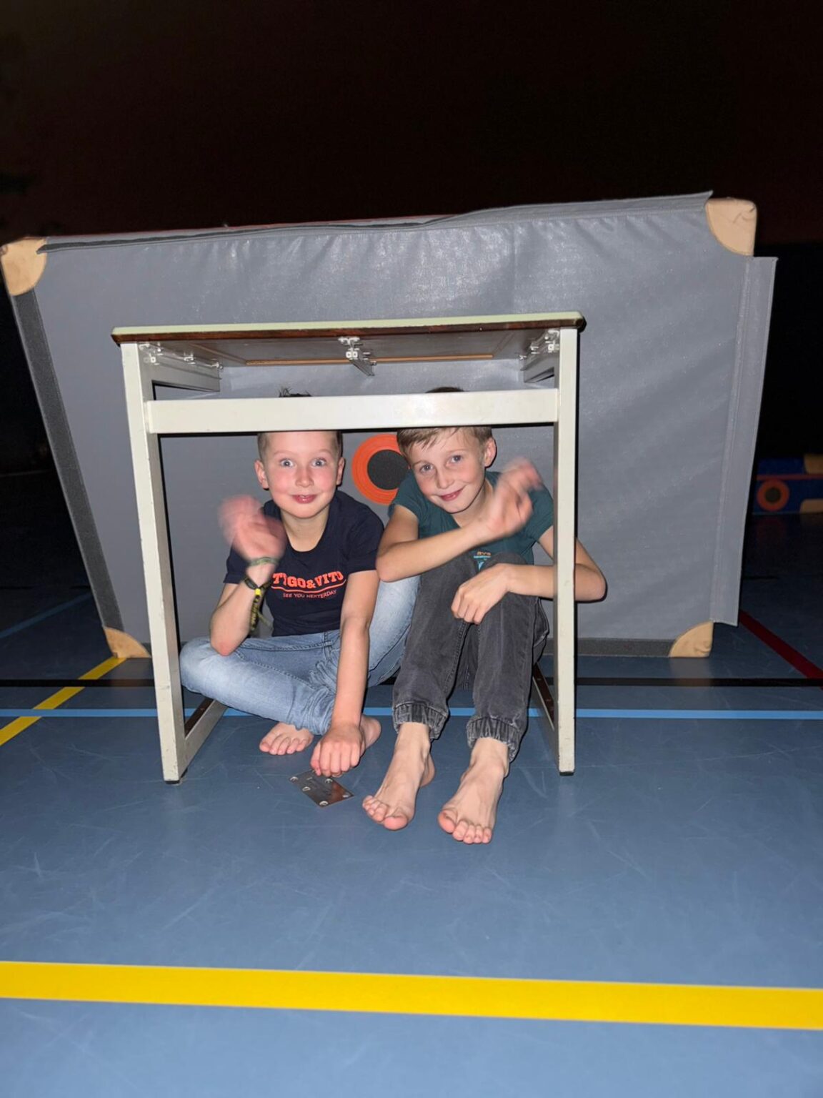 Daar hadden we de zaal in tweeën verdeeld: aan de ene kant speelden we 10 tellen in de rimboe, en aan de andere kant konden de kinderen zich uitleven op het wandrek, met touwen om in te zwaaien en trampolines 🤸♀️.