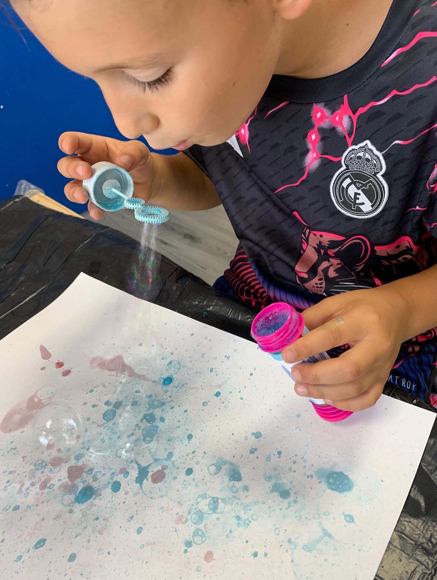 Toen alle kinderen bij De Lanties compleet waren, zijn we naar de bioscoop gegaan. 🎞🍿 We gingen naar de film van Rutger, Thomas en Paco. De kinderen vonden het een super leuke film en zaten heel aandachtig te kijken!🤩 Toen de film was afgelopen zijn we terug naar locatie gegaan, hier hebben we gezamenlijk geluncht.🥪🥪 Daarna hebben we bellenblaas kunst gemaakt. Hiervoor hadden we bij de bellenblaas flesjes kleurstof gedaan. Hierdoor had ieder flesje een eigen kleur. 🧡❤De kinderen hadden voor zich een wit papier en hier konden ze dan een gekleurde bel op blazen, die dan kapot klapte. Hierdoor kreeg je een heel cool gekleurd effect!🤩 Alle kinderen hebben goed mee gedaan en hun eigen geweldige kunstwerk gemaakt!🎨👩🎨