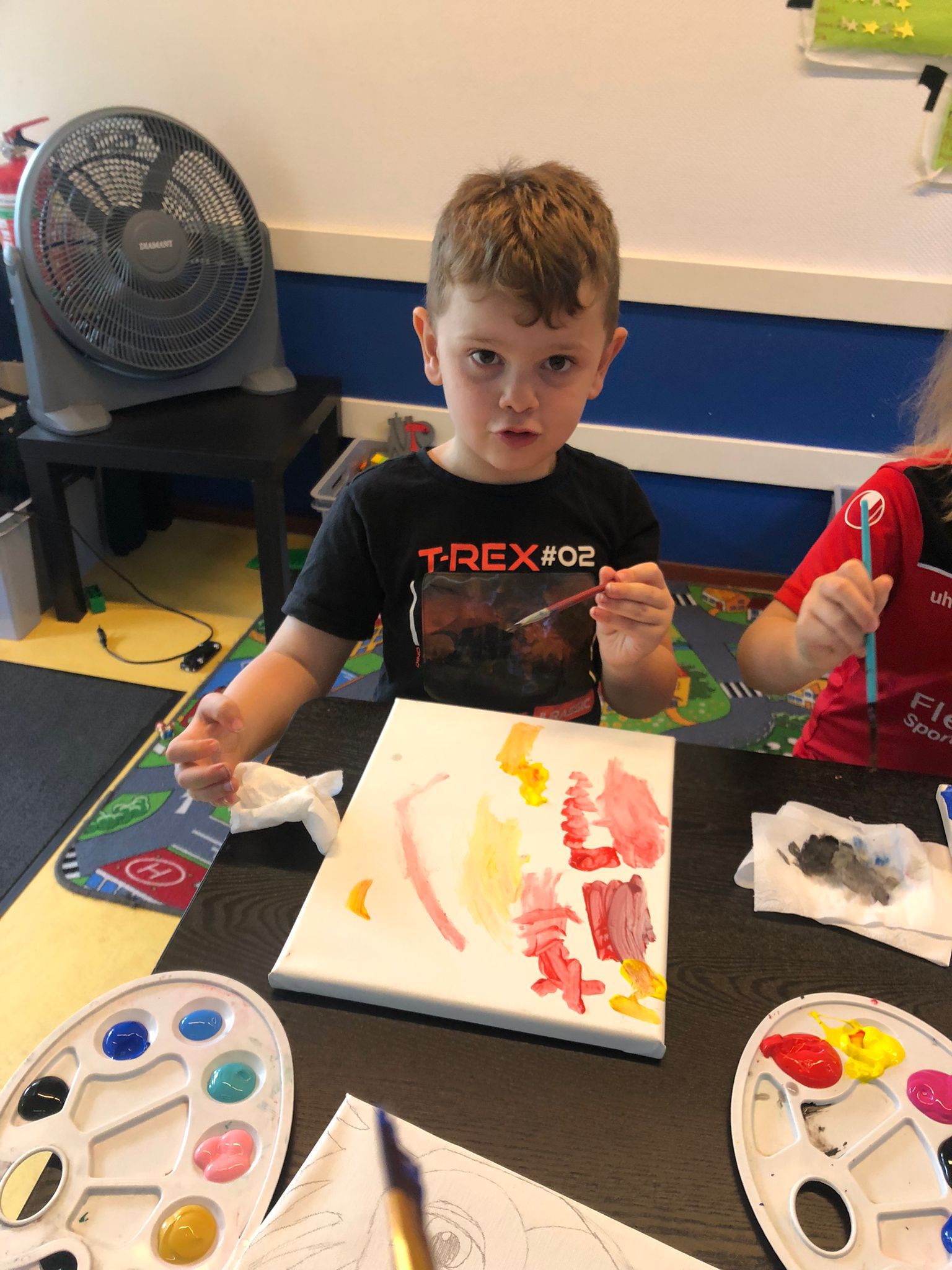 De ochtendactiviteit stond in het teken van schilderen op doeken! Er werden poppetjes, monsters, dieren en vlaggen gemaakt. Iedereen mocht zelf bepalen wat hij of zij wilde maken, en juist dat maakte het zo leuk!🎨