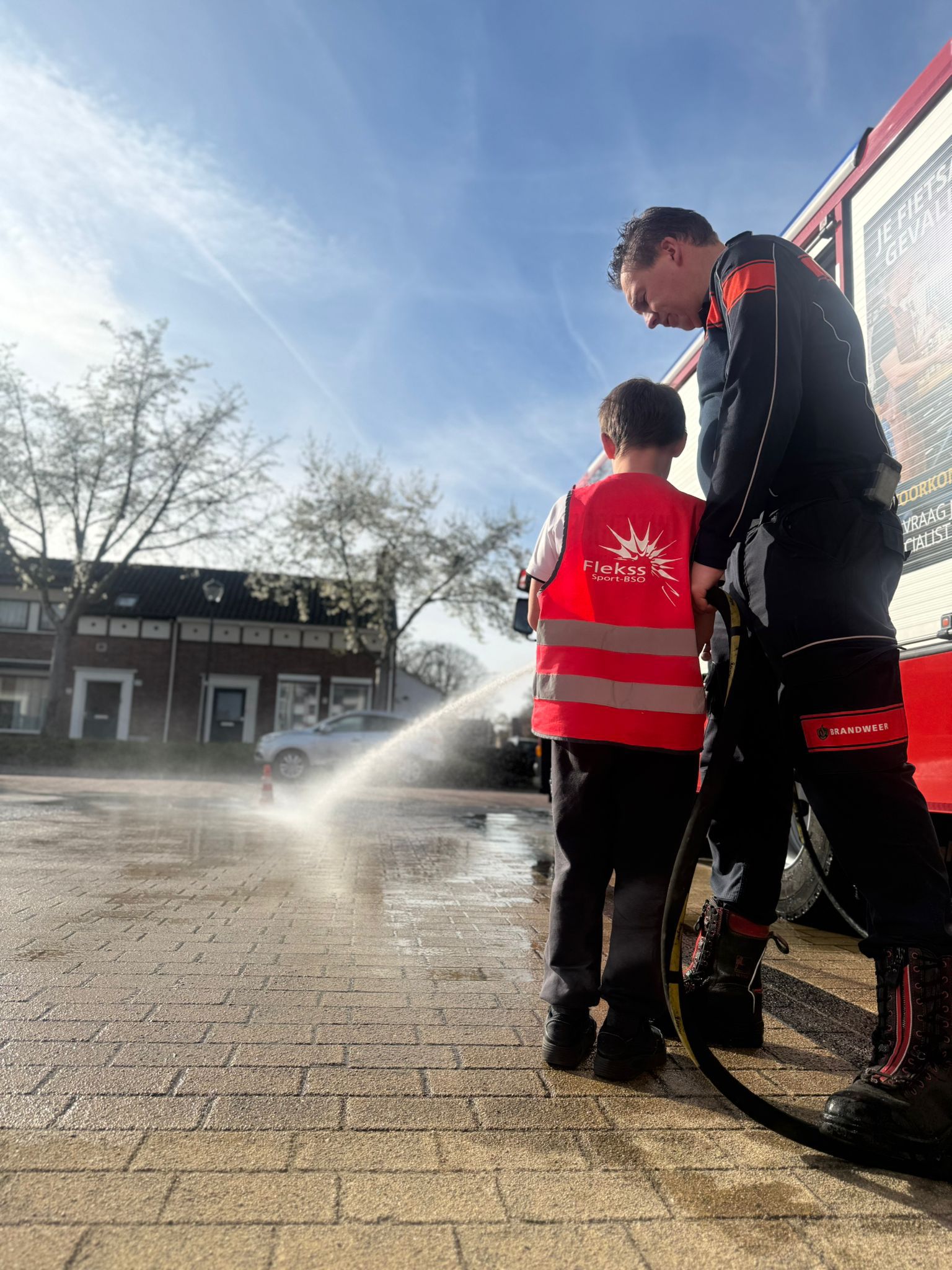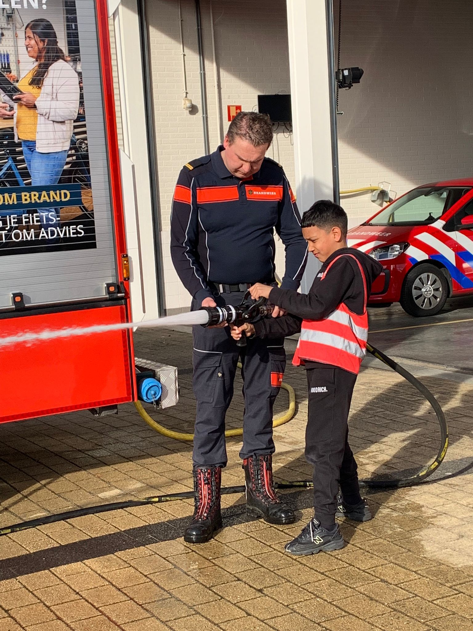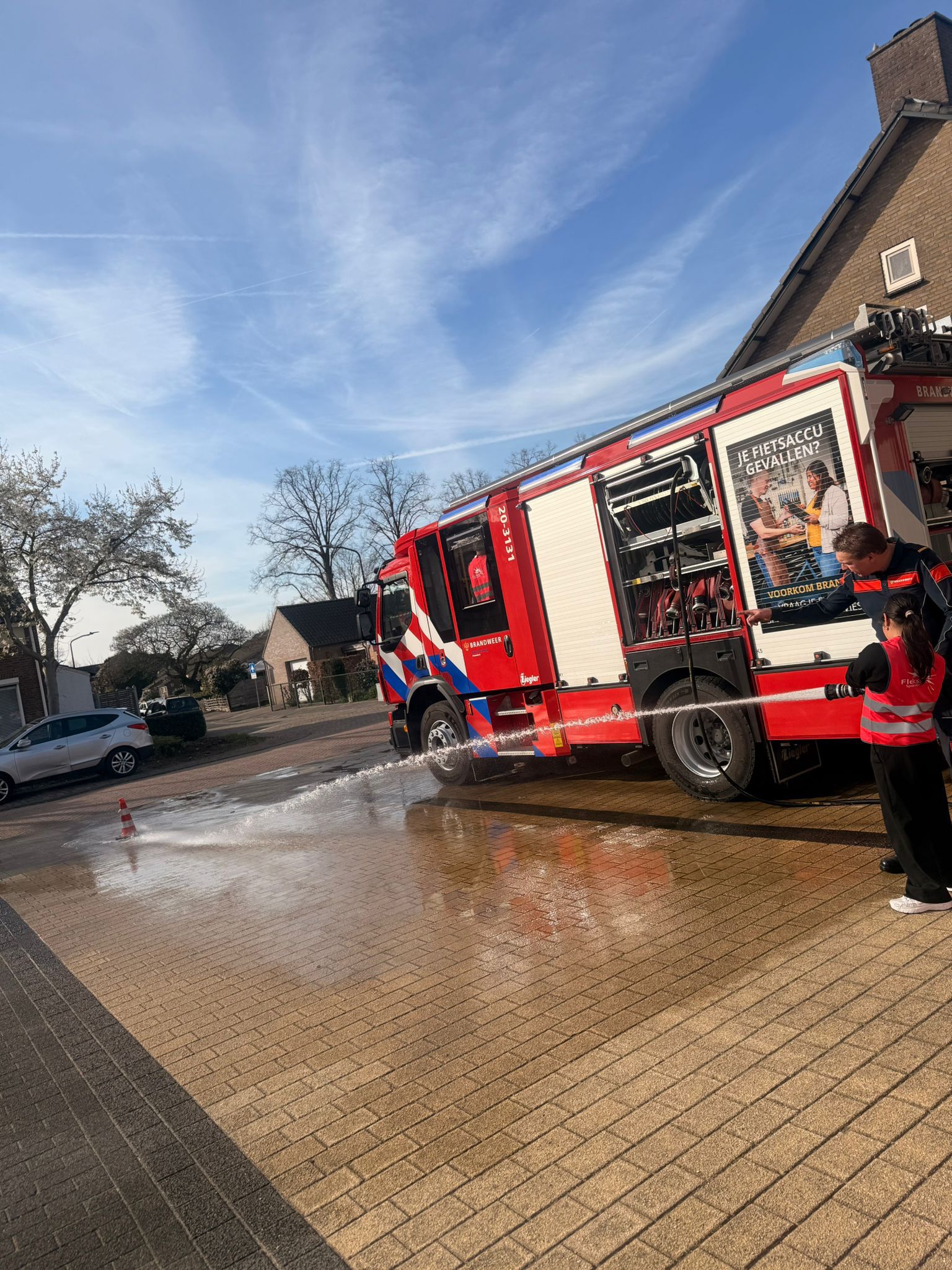 Daarna werd het nog leuker, want we mochten zelf met een echte waterslang spuiten. Dat was best zwaar, maar ook heel gaaf om te doen. We probeerden allemaal zo goed mogelijk te richten, net als echte brandweermannen en -vrouwen. 💧