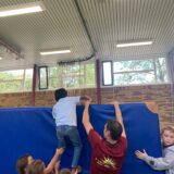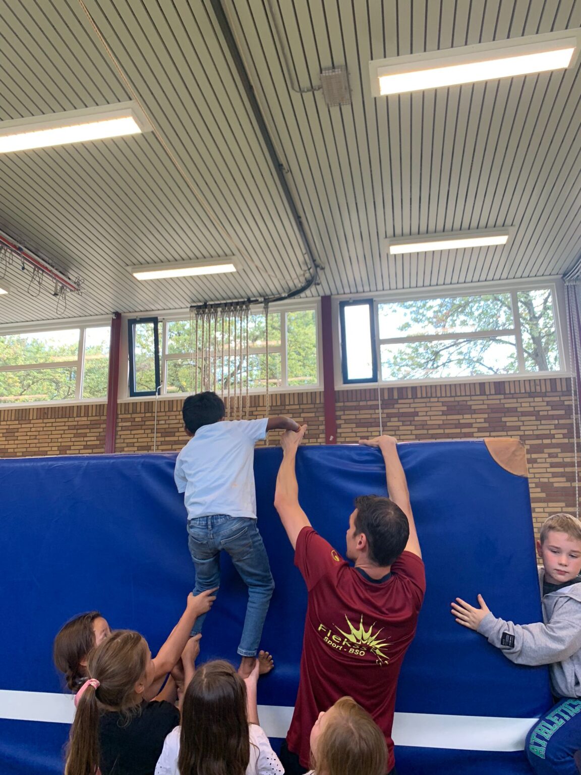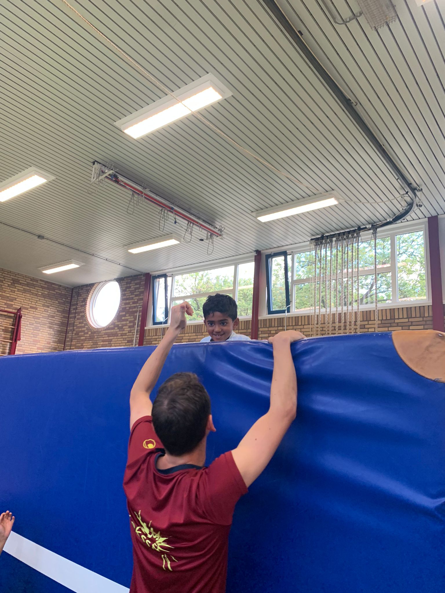 Er word een grote dikke mat vastgehouden door 2 kinderen. Waarna andere kinderen er 1 voor 1 op proberen te klimmen en overheen springen🎉! Dit vergt vee kracht en vertrouwen in elkaar!