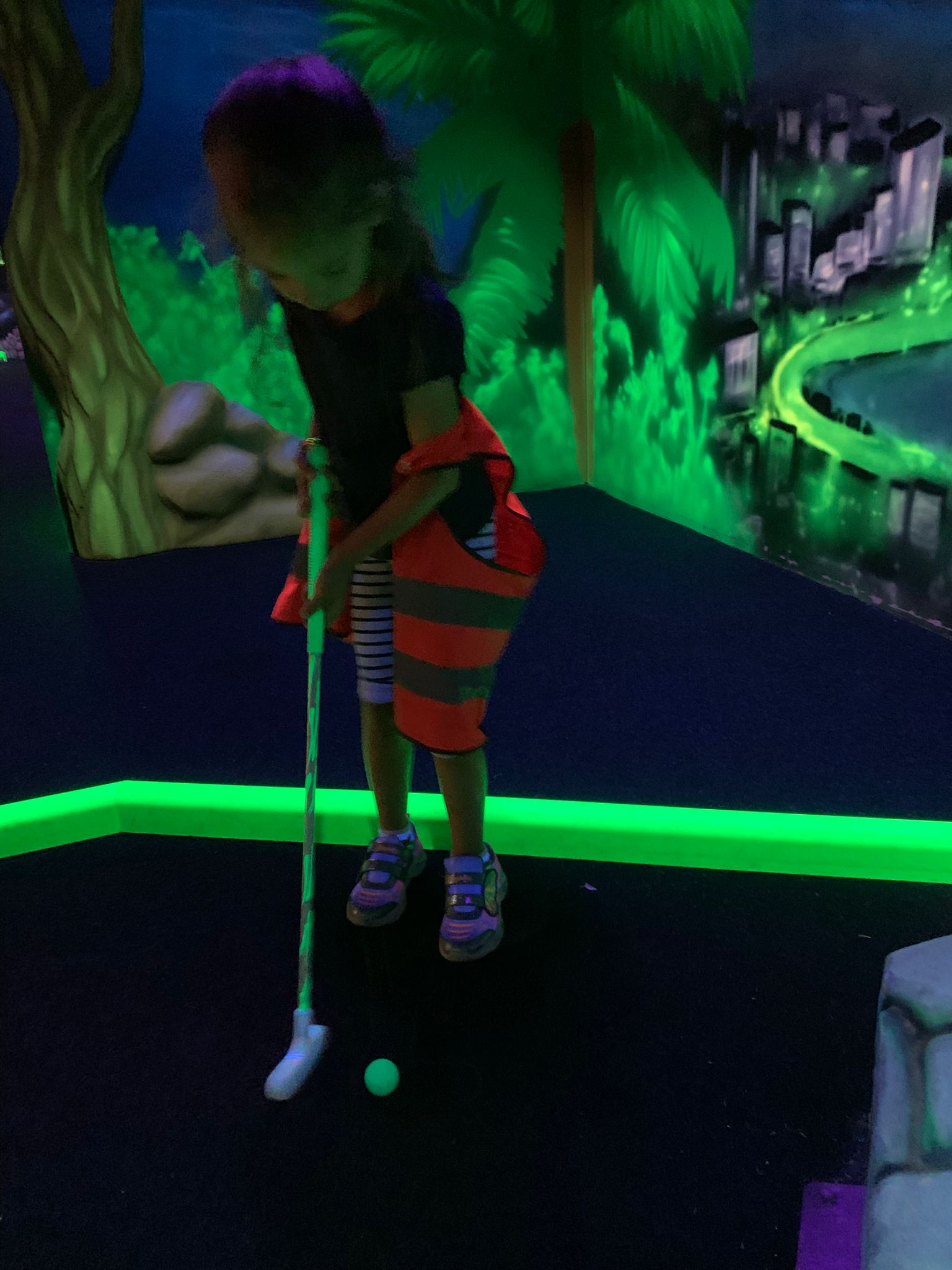 Rond de middag aten we gezellig onze boterhammen op. Dat smaakte heerlijk 😋!Toen was het tijd voor het uitje naar Avontura 🎉! We mochten daar een uurtje gaan glowgolfen ⛳✨ — supercool in het donker! Na het glowgolfen reden we weer terug 🚌, dronken we lekkere ranja en kregen we een snoepje. Daarna was het weer tijd om vrij te spelen. Langzaam werden de kindjes één voor één opgehaald om lekker naar huis te gaan 🏠. Ben jij benieuwd hoe de vorige vakantieweken zijn verlopen of wil je een rondleiding? Kijk dan op: