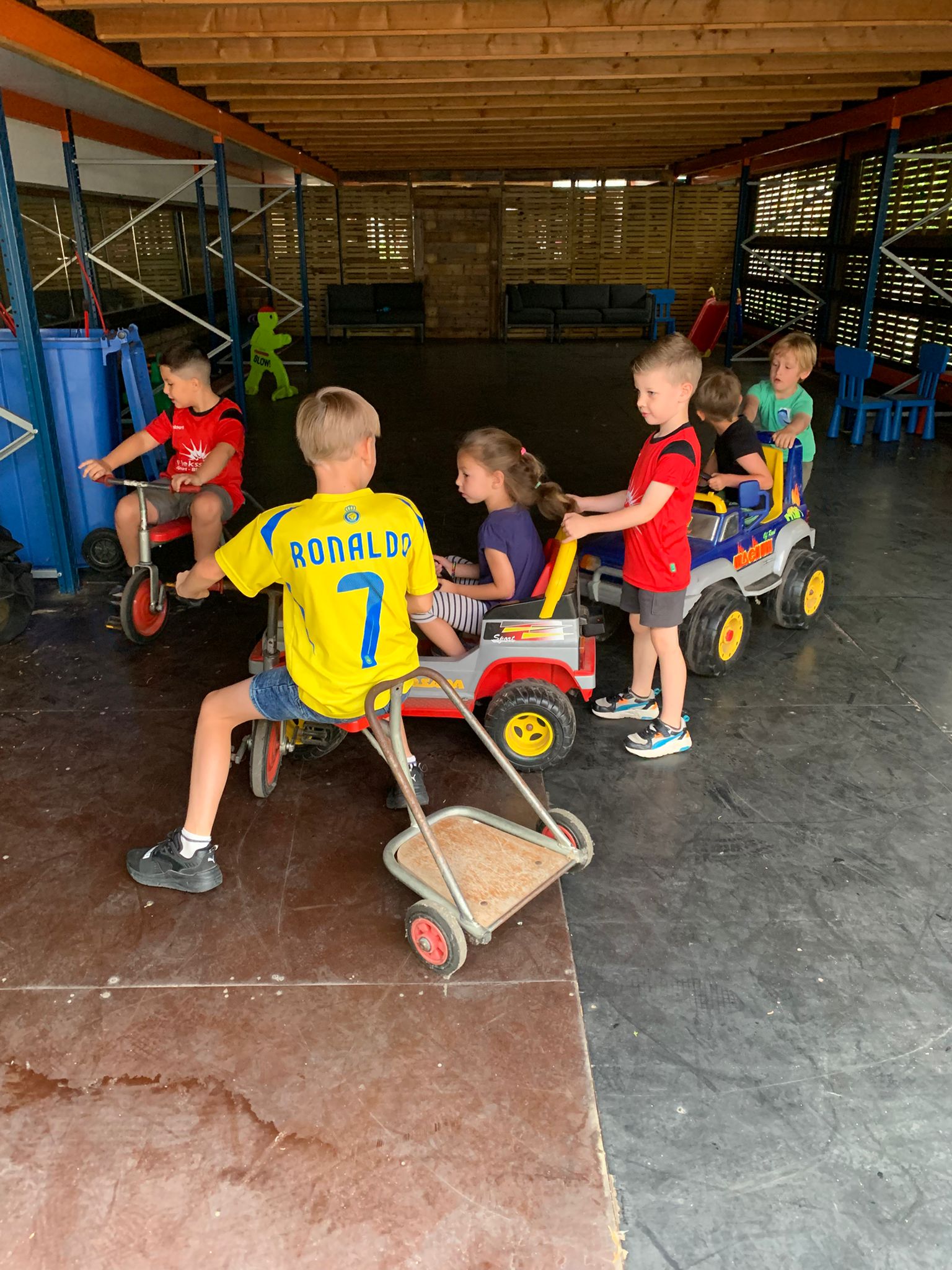 Na de lunch was het meteen tijd om te plassen en in de stint te springen, want we gingen naar Bounce Valley! Gelukkig was het heerlijk weer ☀️, dus haalden we de kap van de stint af. Ook naar Bounce Valley was het een stukkie rijden 😉 — we deden er 40 minuutjes over. Bij aankomst kregen alle kinderen een bekertje 🥤 en mochten ze zelf ranja pakken.