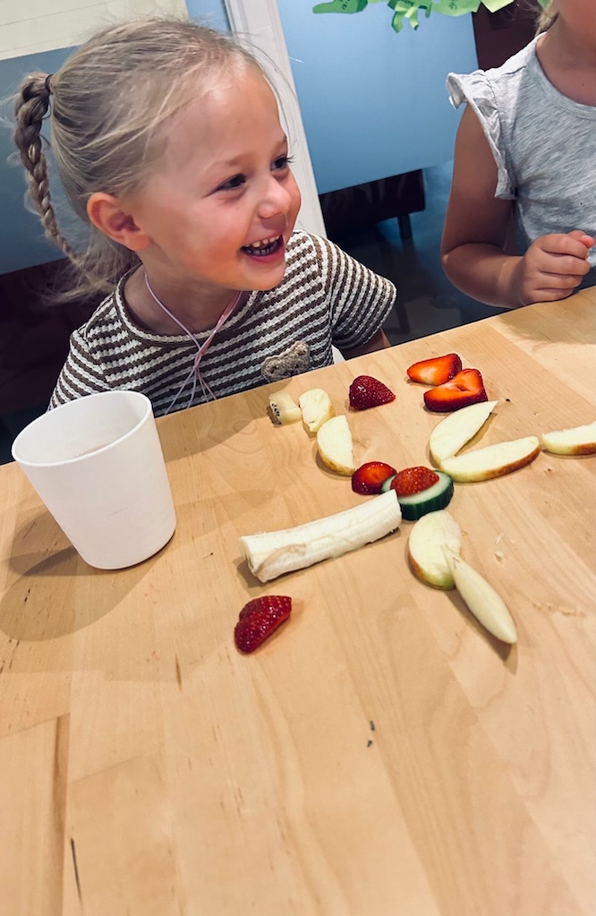 Gelukkig waren de kinderen vooral binnen. We hebben namelijk onze fantasie gebruikt: de kinderen mochten figuurtjes maken van fruit! 🍎🍌
