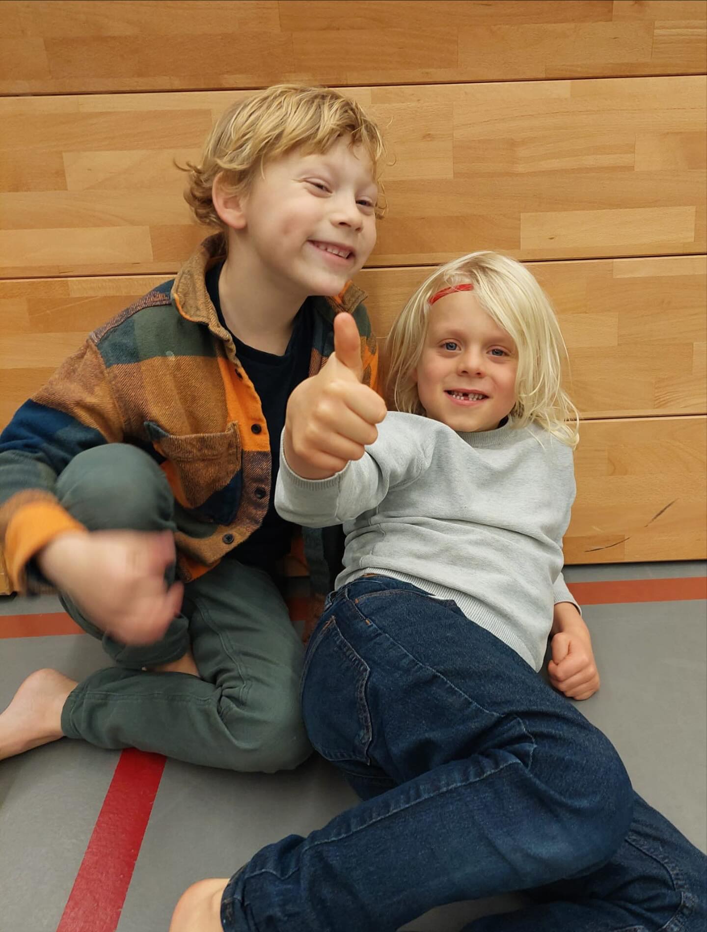 Gymzaal de Scharen. Warming-up met hoepeldans ππ’. Daarna turnen met matten en trampolines π€ΈββοΈ en als afsluiter wc-tikkertje π½πββοΈ.