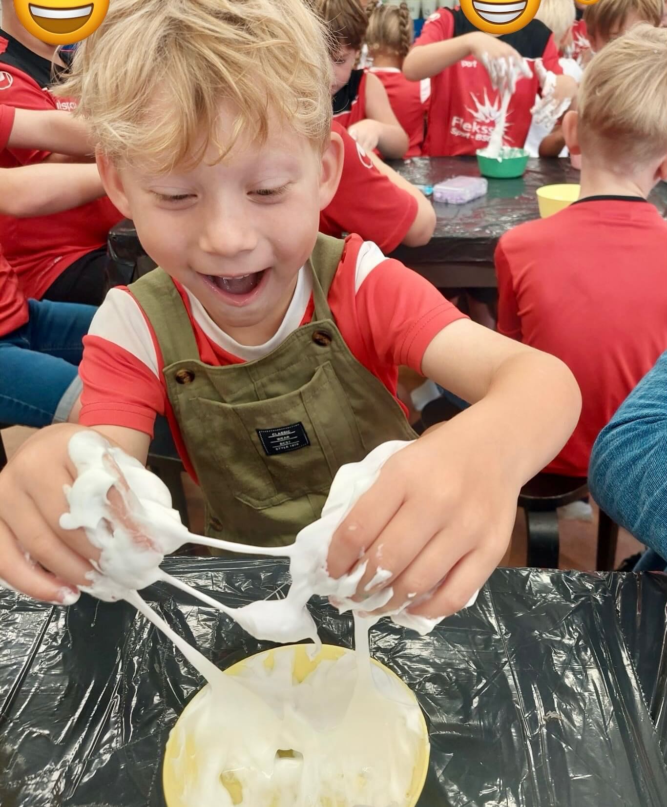 Dus bedachten we iets nieuws: slijm maken! ✨👩🔬👨🔬 Met scheerschuim, lenzenvloeistof en lijm maakten we de mooiste plakkerige creaties. De kinderen hadden de grootste lol 🤩🙌.