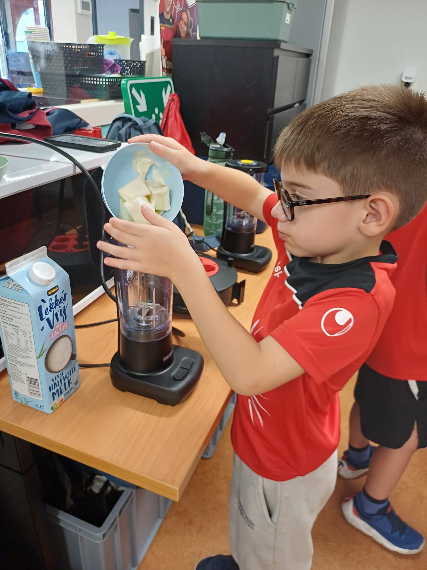 Vandaag startten we de dag gezond 🍎🍌. We maakten smoothies en milkshakes 🥤. Eerst fruit snijden 🔪 en daarna in de blender gooien… en voilà: heerlijke smoothies! 😋 In de middag speelden we met water in de speeltuin 💦. Het was warm maar supergezellig! 😎