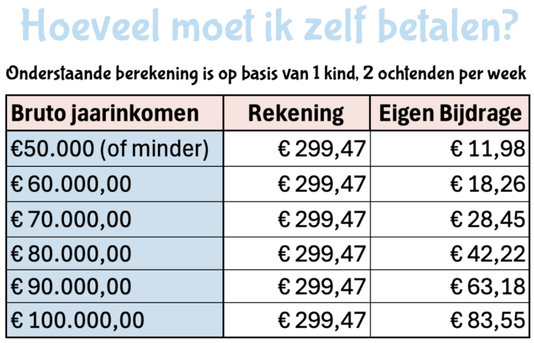 Het tarief bij de peuteropvang van Flekss bedraagt €11,23 per uur. Twee ochtenden per week, komt overeen met 26,66 uur per maand. Daarvoor betaal je maandelijks €299,47. Het maximaal uurtarief kinderopvang 2026 bedraagt €11,23 per uur. Wanneer je in aanmerking komt voor kinderopvangtoeslag, betaal je slechts een deel hiervan zelf.