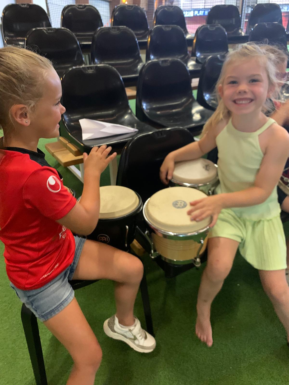 De dag begon met een percussieworkshop. Iedereen kreeg een eigen trommel en samen met meester Arno werd er geoefend. Al snel konden de kinderen een liedje spelen en de oudere groep mocht zelfs een moeilijkere variant proberen.