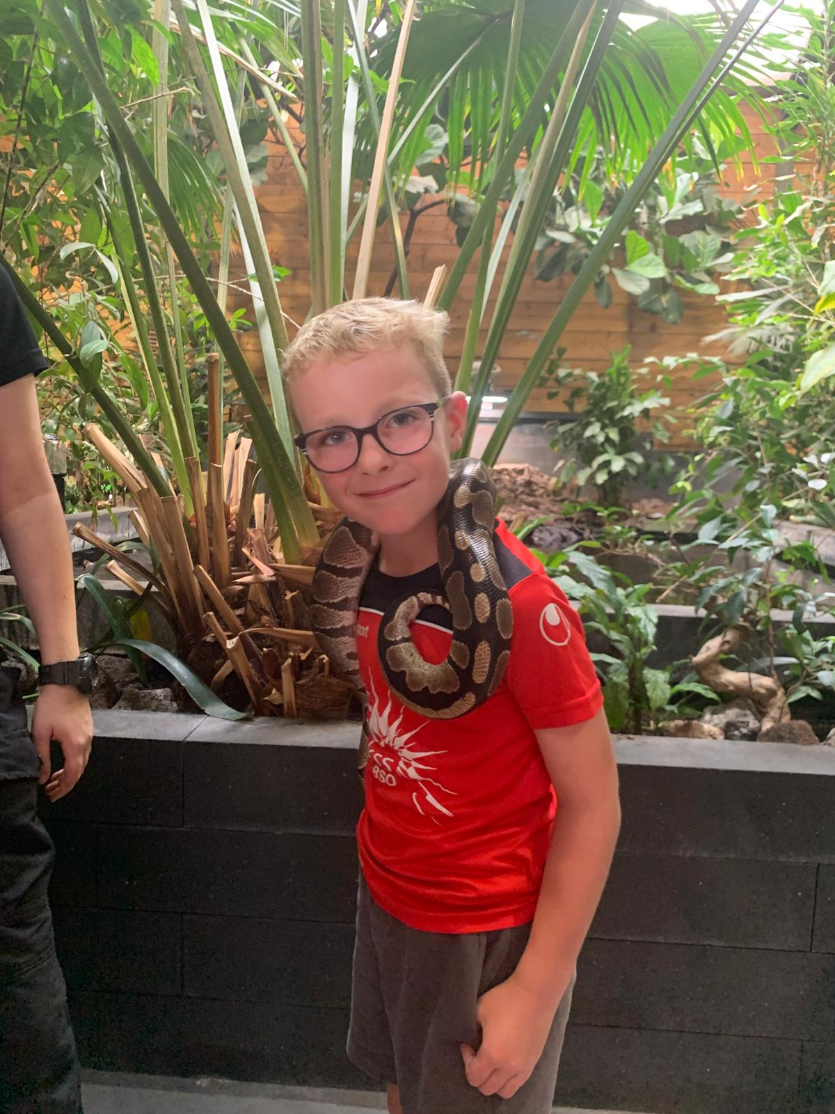 Een spannende dag: we gingen naar reptielenhuis De Aarde! Daar konden we niet alleen schildpadden, kikkers en krokodillen zien, maar ook allemaal een echte slang vasthouden. Dat was best stoer!